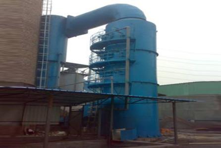 除尘塔由外塔和副塔组成,均用不锈钢板制造。外塔直径2.4m,高12.7m。副塔直径0.5m,设于塔中央,喷淋洗涤用8个旋流喷嘴沿外塔下部环形布置。灰水分离器为普通钢板制造,内壁采用“TO"树脂防腐有效直径2.8m,全高4.3m,中央设有用减速机来牵动的集泥装置,集泥臂上的犁铧沉积的灰泥刮向中心而排出。当集泥臂因故住时,即可停止运行,同时发出声光警报,经处理后,仍恢复不了运行,应用了工清灰。集泥臂卡住是停电或长时间不排泥造成的,停电时间越久,故障越严重,因此要求用户配备双电源。